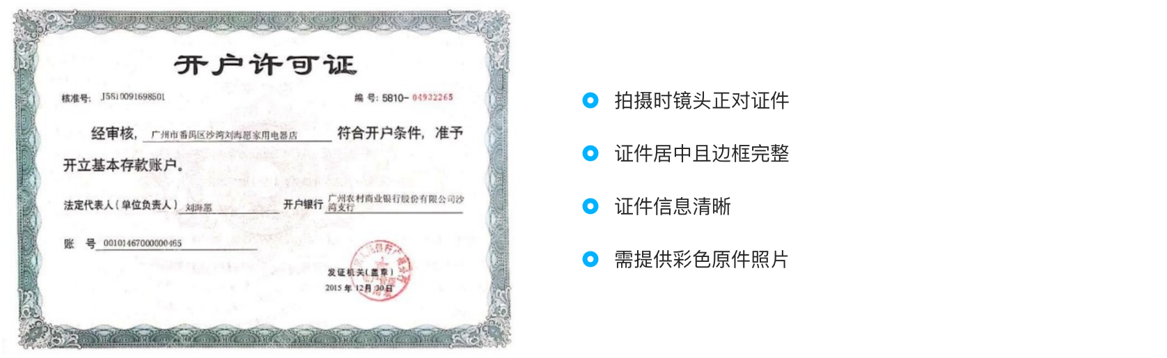 个体工商户:法人银行卡照片/公司对公账户开户许可证或银行回单照片