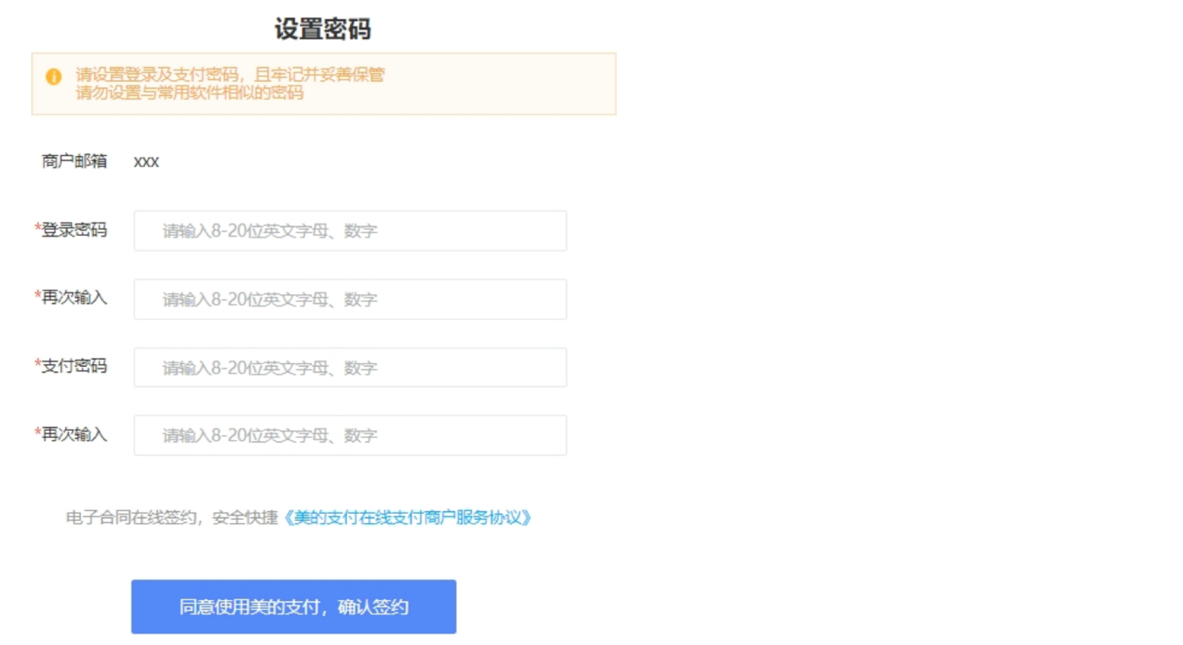 设置商户的登录密码及支付密码,登录密码与支付密码不能相同。